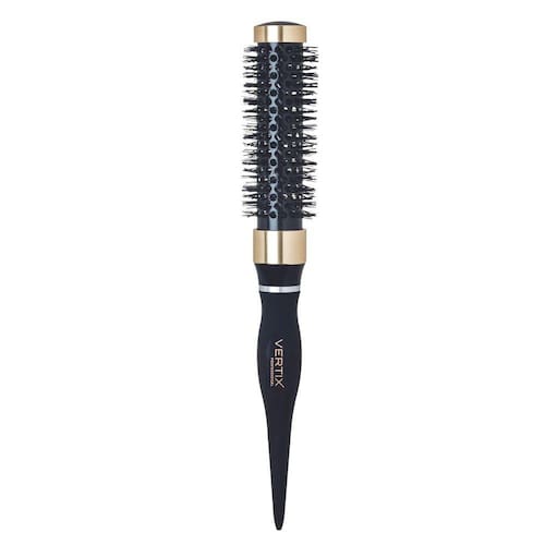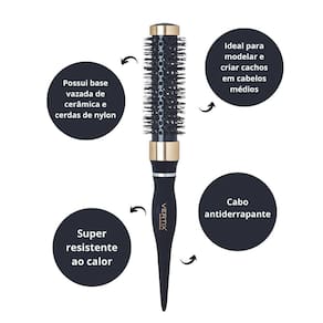 Escova Black and Gold possui base vazada de cerâmica e cerdas de nylon resistentes ao calor. Ideal para modelar e criar cachos em cabelos médios. Cabo antiderrapante. Tamanho pequeno.