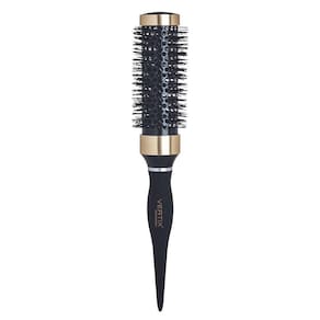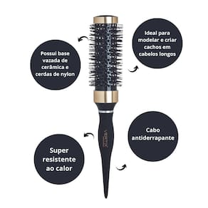 Escova Black and Gold possui base vazada de cerâmica e cerdas de nylon resistentes ao calor. Ideal para modelar e criar cachos em cabelos muito longos. Cabo antiderrapante. Tamanho médio.