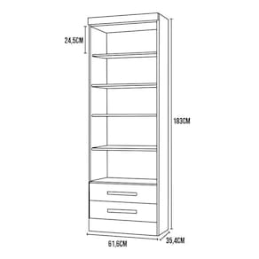 Material: MDP 12/ 15 Acabamento: Pintura Uv Quantidade de Gavetas: 2 Quantidade de Prateleiras 5 Peso Suportado nas Gavetas: 5 Kg Distribuídos sem Impacto Peso Suportado nas Prateleiras: 7 Kg Distribuídos sem Impacto Altura (mm):1830 Largura (mm): 616 Profundidade (mm): 354 Peso Kg: 27,800