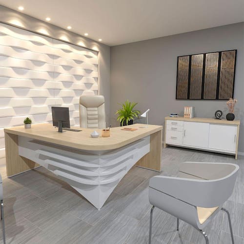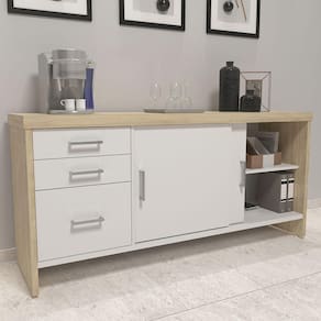 O(a) Escritório Completo Executiva Tamburato 2 Portas 3 Gavetas Branco/Carvalho - Artany Móveis é produzido em MDP, PVC e Tamburato na escala de brilho Fosco, e possui um grau de dificuldade de montagem: Médio.