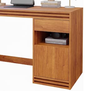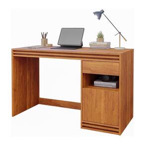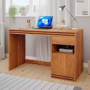 Esta escrivaninha é uma adição elegante e funcional para qualquer espaço de trabalho ou estudos. Com uma estrutura em MDP durável, possui um tampo amplo e resistente, além de uma gaveta e uma porta com espaço interno generoso para armazenamento. O nicho entre a gaveta e a porta oferece ainda mais praticidade, enquanto os detalhes ripados adicionam um toque de elegância e modernidade ao móvel.
