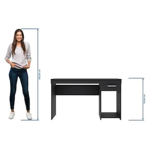 ALTURA (CM): 75,3 | LARGURA (CM): 108,1 | PROFUNDIDADE (CM): 41 | Cômodo Indicado: Escritório | Produto: Mesa de Escritório | Tonalidade: Preto | Conteúdo da Embalagem: 1 Mesa de Escritório, Kit Ferragens e Manual de Montagem | Material: MDP | Cor: Preto