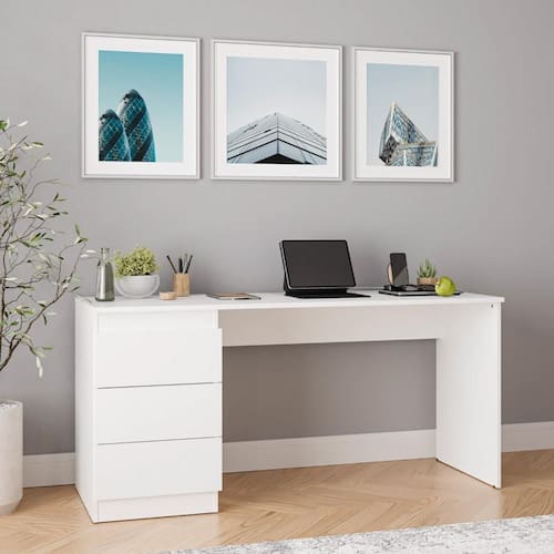 Escrivaninha 163cm 3 Gavetas Hera CabeCasa MadeiraMadeira Branco Geada. A Escrivaninha Hera CabeCasa foi desenvolvida para compor a linha de modulares Hera, trazendo a experiência de ter seu ambiente customizado de acordo com a necessidade do seu espaço. O móvel conta com três gavetas com detalhe de puxador passante lateral e ainda possui passagem de cabo na superfície do tampo, evitando assim exposição de cabeamento. Com essa proposta, CabeCasa oferece para seus clientes a possibilidade prática e custo-benefício em oferecer uma linha de modulados que faça a função de um móvel planejado. O cliente pode escolher entre os sete módulos disponíveis, em diferentes variações de acabamentos, os que mais se adaptam ao seu gosto e ao seu dia a dia. Além disso, conta com design moderno que irá trazer muito mais sofisticação e aconchego para a decoração.