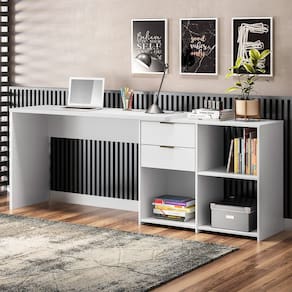 A Escrivaninha Office NT 2060 da Notável Móveis, é um móvel completo que vai te auxiliar nas atividades do home office ou estudos. Com ela, você tem diversas possibilidades de montagem: de canto, montada reta, com o nicho para o lado direito ou esquerdo e você também pode escolher em que lado colocar as gavetas! O tampo de 25 mm é super espaçoso para você organizar itens essenciais ao dia a dia, e as gavetas possuem corrediças metálicas para guardar documentos e demais objetos. Um móvel moderno que vai atender as suas necessidades!
