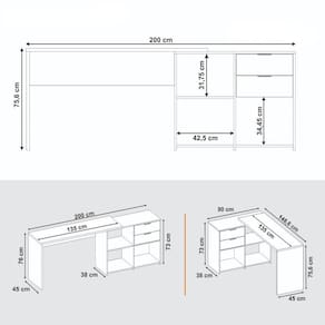 Dimensões: Altura: 73,1 e 75,6 cm Largura: 90 e 200 cm Profundidade: 38,2 e 148,5 cm Peso: 48 kg