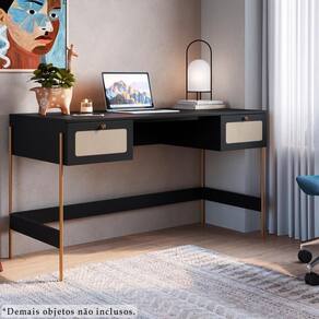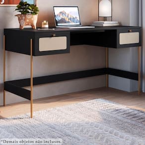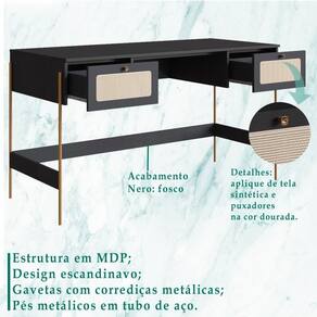 Escrivaninha 28931, Linha Oslo Artesano. Traz como característica um traço artesanal, suave e acolhedor. Possui estrutura em MDP de 15mm, acabamento em pintura BP e Pés de tubo metálico em aço e pintura epóxi na cor dourada. Composto por duas gavetas com corrediças metálicas, puxadores de poliestireno na cor Dourado, aplique de tela sintética (PVC com poliéster), fixada na parte externa das gavetas, as extremidades dos pés possuem ponteiras plásticas para evitar atrito do móvel com o piso, conta ainda com longarina metálica embaixo do móvel para evitar empenamento, móvel com ampla superfície para trabalho e estudos, com design escandinavo minimalista, é a opção ideal para um ambiente com toque sofisticado e ao mesmo tempo aconchegante. Mais produtos da Linha Oslo, você encontra em nosso site, podendo fazer a composição completa para sua casa, são diversos itens com design prático e funcional para tornar a vida mais facil e a casa mais alegre. Este móvel chegará em sua casa separado em 01 volume.