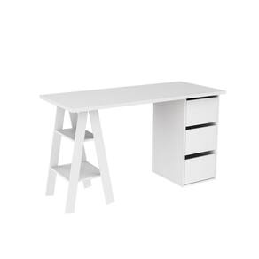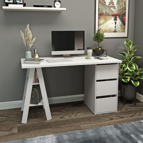 Mesa Cavalete com 3 Gavetas, MB 1035, da Movelbento tem Um Design Moderno e Leve. Os Pés Semelhantes a Cavaletes Ampliam o Ambiente, 2 Prateleiras e 3 gavetas para Guardar Diferentes Tipos de Objetos. Seu Tampo Amplo e robusto de 25mm. Um Jeito Despojado de Trazer a Organização e Funcionalidade Ao Ambiente de Trabalho e Estudo, no Mais Alto Estilo. Produto Montado: Sim Acabamento da Gaveta: Pintura UV Acabamento da Prateleira: Pintura UV Ambiente Principal: Escritório codigo_ean: 7909903345429 Complexidade da Montagem: Baixa: pode ser montado por uma pessoa sozinha Cor: Branco Cor do Produto: Branco Cor Interna: Branco Escala de Brilho: Fosco Escala de Brilho da Prateleira: Fosco Espessura do Tampo: 25 mm Formato: Retangular Gaveta com Chave: Não Itens Inclusos: 1 Escrivaninha, Kit Ferragens e Manual de Montagem Manual de Montagem e Instalação: https://product-hub-prd.madeiramadeira.com.br/856744/documents/cdc47975-ce7e-4b53-9921-994a371152901386979mb1035.pdf Material da Estrutura: MDP Material da Gaveta: MDP Material da Prateleira: MDP Material do Tampo: MDP Material Principal: MDP Montagem Flex: Sim Necessita Montagem: Sim Origem do Produto: Nacional Peso: 33,5 kg Peso Máximo por Gaveta: 3 kg Peso Máximo por Prateleira: 5 kg Possui Passa Cabos: Não Possui Portas: Não Possui Suporte para Teclado: Não Recomendações de Uso, Manutenção e Limpeza: Antes de limpar recomenda-se que seja retirada toda a poeira com um espanador ou flanela seca para evitar riscos na superfície, após utilize um pano umido em água, macio e limpo. Sapatas Niveladoras: Não Sistema de Montagem: Parafuso, cavilha e minifix Suporta Até (kg): 25 kg Tipo de Corrediça da Gaveta: Metálica Simples Tipo de Puxador da Gaveta: Embutido