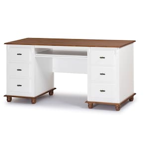 Procurando uma escrivaninha com gavetas para o seu escritório ou home office? A Escrivaninha Linz Office é a escolha ideal, pois com seu amplo tampo em madeira maciça, 6 gavetas com corrediças telescópicas, você terá espaço de sobra para armazenar papéis, canetas e outros materiais de escritório. Além disso, possui suporte para teclado, permitindo uma superfície de trabalho mais ampla e confortável e detalhes divisores de ambiente. Os pés e base em madeira maciça e puxadores metálicos dão um toque de elegância e requinte ao móvel. Produzida em Madeira Maciça para tons amadeirados em verniz e MDF nos tons coloridos com acabamento laca, garantindo qualidade e durabilidade, para que você possa aproveitar ela por muitos anos. A escrivaninha retro é uma excelente escolha para quem procura exclusividade, sofisticação e requinte.