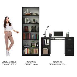 Já a Escrivaninha possui tampo de madeira, três gavetas espaçosas com corrediças metálicas e um nicho abaixo do tampo, com abertura na parte de trás. Além disso, conta com uma porta com dobradiça metálica e espaço interno para guardar objetos. Pode ser usada como mesa de apoio ou para e .