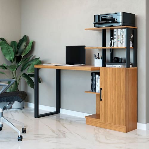 Produzida em 100% MDF e com pintura UV de 6 camadas, a escrivaninha oferece durabilidade e resistência. Seu balcão lateral fechado com porta basculante e cinco prateleiras abertas proporcionam amplo espaço para organização de livros, documentos e materiais de escritório.
