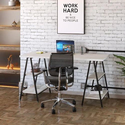 A Mesa Cavalete KUMC6150 Kuadra é um produto prático e versátil, que pode ser utilizado em diversos ambientes, como quarto e escritório, na sala, cozinha ou seu depósito. Conta com 04 prateleiras reforçadas e seu design industrial permite diversas composições de decoração com os demais módulos da linha. Pés com espessura de 30x20mm. Produto Montado: Sim Acabamento da Prateleira: BP Acabamento dos Pés: Pintura Ambiente Principal: Escritório codigo_ean: 7909903211885 Complexidade da Montagem: Média: pode ser montado por mais de uma pessoa e/ou necessite de maior conhecimento para montagem Cor: Snow/Preto Cor do Produto: Snow/Preto Cor Interna: Snow Escala de Brilho: Fosco Escala de Brilho da Prateleira: Fosco Espessura do Tampo: 30 mm Formato: Retangular Gaveta com Chave: Não Itens Inclusos: 1 Escrivaninha, Kit Ferragens e Manual de Montagem Linha ou Coleção: Kuadra Manual de Montagem e Instalação: https://product-hub-prd.madeiramadeira.com.br/806616/documents/2ea461cd-7409-4828-9278-1af4c47f1c4c1108761manualnovocavalete.pdf Material da Prateleira: MDP Material dos Pés: Aço Material Principal: MDP Montagem Flex: Não, só é possível a montagem do produto conforme imagem do anúncio. Necessita Montagem: Sim Origem do Produto: Nacional Peso: 25,79 kg Peso Máximo por Prateleira: 5 kg Possui Passa Cabos: Não Possui Pés: 02 Possui Porta Objetos: Não Possui Portas: Não Possui Prateleiras: Sim Possui Suporte para Teclado: Não Quantidade de Prateleiras: 04 Prateleiras Recomendações de Uso, Manutenção e Limpeza: Para a limpeza, utilize flanela seca ou pano macio levemente umedecido em água. Utilize um pano seco em seguida. Evite contato com produtos químicos (solventes, thinner, acetona, etc) e não utilize nenhum tipo de esponja de aço. Sapatas Niveladoras: Sim Sistema de Montagem: Parafusos Suporta Até (kg): 50 kg Ean: 7909903211885