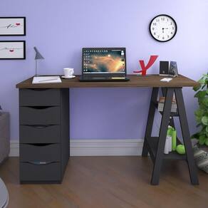 Criatividade e versatilidade são as palavras que definem a Escrivaninha Spirit Preto/Nogal, da Linha Mobile desenvolvida pela Artany. A combinação dos pés cavalete de um lado e das 5 gavetas com corrediças metálicas do outro, ambos apoiando o tampo é o que faz essa peça e criativa.