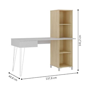 Ela é indicada para Escritórios, Salas de Estar ou Quartos. Ela possui tampo de 18mm com borda ABS de 2mm. Possui também uma gaveta com corrediça telescópica, duas prateleiras com regulagem de altura.