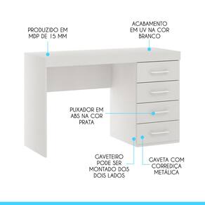A Mesa Escrivaninha é um móvel útil e versátil que promete ser o protagonista do seu ambiente. Dispõe de um design atual que facilita na hora de montar a decoração, proporcionando um espaço mais aconchegante e organizado. Possui tampo espaçoso e quatro gavetas para armazenar seu material de uso diário. A mesa escrivaninha é produzido com materiais de excelente qualidade, garantindo a sua durabilidade. O melhor em móveis no design atual aliando conforto, qualidade e ótimos preços, só na Menu Móveis! CARACTERÍSTICAS TÉCNICAS: - Produzida em MDP de 15 mm - Acabamento UV na cor Branco - Gaveta com Corrediça Metálica - Puxador Alça em ABS na cor Prata *Gaveteiro pode ser montado dos dois lados. INFORMAÇÕES TÉCNICAS: Altura: 75,5 Cm Largura: 120 Cm Profundidade: 46,5 Cm Peso: 29,5 Kg INFORMAÇÕES ADICIONAIS: - ATENÇÃO: Não trabalhamos e não nos responsabilizamos pela montagem do móvel. Antes da montagem conferir se o produto está de acordo com o que comprou, produto montado e danificado pela montagem não será aceito troca. Montagem e instalação por conta do comprador. - As imagens ambientadas são meramente ilustrativas e podem apresentar itens que não compõe o produto. As cores do produto podem variar de acordo com o monitor, a iluminação do ambiente ou sua percepção visual. - Limpeza: Deve ser feita com pano macio e seco ou levemente umedecido com água e sabão neutro. Não devem ser utilizados abrasivos como palha de aço e objetos cortantes. Garantia para defeitos de fabricação conforme Código de Defesa do Consumidor. Ean: 6015057222262 Ean: 6015057222262