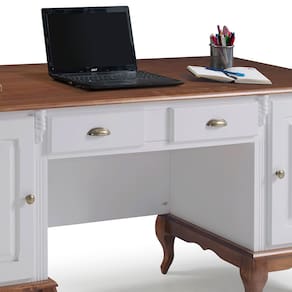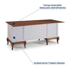 A Escrivaninha de Madeira Hannover com 2 Portas e 2 Gavetas com Tampo Estendido Linz Moveis é perfeita para o seu escritório, home office ou sala de atendimento. Seu espaçoso tampo em madeira maciça possui um recuo de 18cm garantindo espaço de sobra para suas atividades, com suas duas gavetas centrais com corrediças telescópicas você terá espaço de sobra para armazenar papéis, canetas e outros objetos. Além disso, possui duas portas com prateleira interna oferecendo ainda mais espaço para guardar itens e organizá-los. Os pés no estilo Luis XV em madeira maciça e puxadores metálicos dão um toque clássico, elegante e requintado ao móvel.