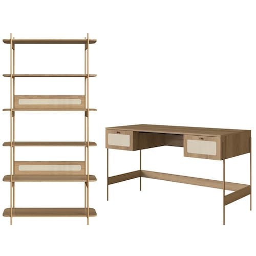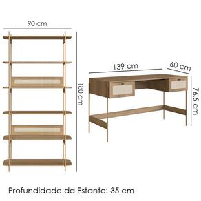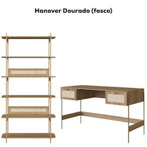 Estante Livreiro e Escrivaninha 28974, o conjunto ideal para tornar seu home office mais elegante! Estruturas Metálicas com acabamento em pintura epóxi. Composto por prateleiras e base em MDP 15 mm e acabamento BP, cantos arredondados, fundo em MDF 3 mm, gavetas com corrediças metálicas (mesa) e detalhes em aplique em tela sintética (PVC) imitando palhinha e puxadores em Poliestireno (dourado). Destaque fica para a travessa inferior em MDP e longarina metálica anti empenamento. Produto será entregue em 02 volumes.