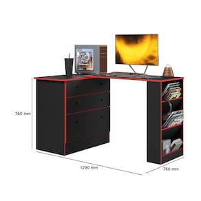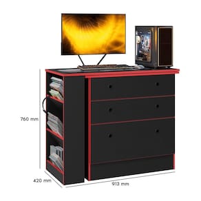 Esta é a Cômoda com Mesa Giratória Gamer, um produto multiuso que tornará seus dias muito mais práticos e organizados. Use como cômoda, aproveitando o amplo espaço das gavetas para acomodar roupas, acessórios ou itens de estudo e home office; use também como mesa, seu tampo extensível projetado com um ângulo de 90º, permite otimizar o espaço e oferecerá um local extra para trabalhar ou estudar. Produto Montado: Sim Acabamento do Tampo: Pintura UV Acompanha Manual de Instalação: Sim Ambiente Principal: Escritório codigo_ean: 7900288160331 Complexidade da Montagem: Alta: deve ser montado por um montador especializado Cor: Preto Fosco/ Vermelho Cor da Base: Preto Cor do Produto: Preto Fosco/ Vermelho Cor do Tampo: Preto Cor Flex: NÃO Cor Interna: Preto Dobrável: Não Escala de Brilho: Fosco Espessura do Tampo: 15 mm Formato: Retangular Gaveta com Chave: Não Itens Inclusos: 1 Comoda, 1 Escrivaninha e Manual de Intrução Linha ou Coleção: Módulos e Complementos Manual de Montagem e Instalação: https://product-hub-prd.madeiramadeira.com.br/433080331/documents/55873bd2-3668-48e8-9bc6-e9df2a43b5cf2955557128417483520177354.pdf Marca: Qmovi Material da Estrutura: MDP Material do Puxador da Gaveta: Plástico Material do Puxador da Porta: Plástico Material do Tampo: MDP Material Principal: MDP Modelo Infantil: Não Montagem Flex: NÃO Necessita Montagem: Sim Origem do Produto: Nacional Pés com Regulagem de Altura: Não Pés Reguláveis: Não Peso: 30 kg Peso Máximo por Gaveta: 5 kg Peso Máximo por Prateleira: 3 kg Posição da Gaveta: Frontal Possui Acabamento na Parte de Trás: Não Possui Borda Arredondada: Não Possui Caixa de Tomada: Não Possui Espelhos: Não Possui Estante: Não Possui Gaveta para Pasta Suspensa: Não Possui Gaveteiro: Sim Possui Painel de TV: Não Possui Passa Cabos: Não Possui Porta Objetos: Sim Possui Portas: Não Possui Prateleiras: Sim Possui suporte para CPU: Não Possui Suporte para Teclado: Não Possui Vidro: Não Quantidade de Gavetas: 03 Gavetas Quantidade de Nichos: Não Quantidade de Prateleiras: 03 Prateleiras Recomendações de Uso, Manutenção e Limpeza: Não utilize produtos químicos ou abrasivos para limpar seus móveis. A manutenção em geral, exige apenas a retirada do pó com um pano seco. Mas, a limpeza também pode ser feita utilizando um pano levemente umedecido com água e/ou álcool. Em seguida, a superfície deve ser seca com a ajuda de um pano limpo e macio. Não expor o produto diretamente à luz solar. Sapatas Niveladoras: Não Sistema de Montagem: Cavilhas e parafusos Suporta Até (kg): 44 kg Suporta Braço Articulado: Não Tipo de Corrediça da Gaveta: Metálica Simples