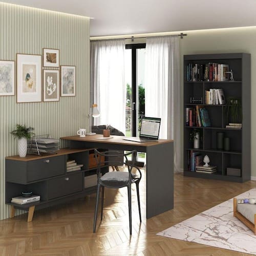 Estante livreiro com diversas prateleiras, uma maneira ideal para organizar seu lar e valorizar a decoração da sua casa com grande estilo. Um produto com materiais e acabamento de ótima qualidade, tudo que você precisa para decorar a sua casa. Altura do Conjunto: 181 cm Ambiente: null Ambiente Principal: Escritório codigo_ean: 7909903421086 Cor: Grafite/Nogal Cor do Produto: Grafite/Nogal Informação Complementar: 1x Mesa Escrivaninha em L 120x136cm Retrô 2 Portas Pés Madeira Maciça Grafite/Nogal Largura: 136 cm Altura: 75,5 cm Peso: 37 kg Profundidade: 45 cm Necessita Montagem: Sim