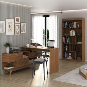 1x Mesa para Escritório Escrivaninha em L Retrô 136x120cm Nogal Largura: 136 cm Altura: 75,5 cm Peso: 37 kg Profundidade: 45 cm Necessita Montagem: Sim
