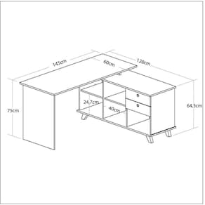 Trabalhe e estude de maneira organizada e produtiva com esta linda Escrivaninha, perfeita para você transformar o ambiente em um local agradável e charmoso. Seu belo design retrô é proporcionado pelos pés angulados, detalhe que faz toda a diferença na aparência final. É muito versátil e tem estrutura flexível, podendo ser montada para o lado esquerdo ou direito, se adaptando ao seu espaço. Os nichos e as gavetas são ideais para manter o local organizado, já que guardam todos os seus objetos, livros e materiais com elegância. O amplo tampo garante muito conforto e comodidade, para você trabalhar ou estudar com muito espaço para seu computador, notebook, papéis e livros. Materiais e o revestimento de alta qualidade proporcionam a beleza e alta qualidade que seu Quarto, Home Office ou Escritório merece. Acabamento da Gaveta: BP Acabamento da Prateleira: BP Acabamento dos Pés: BP Ambiente Principal: Escritório Complexidade da Montagem: Alta: deve ser montado por um montador especializado Cor: Freijó/Grafito/Branco Cor do Produto: Freijó/Grafito/Branco Cor Interna: Branco Escala de Brilho: Fosco Escala de Brilho da Gaveta: Fosco Escala de Brilho da Prateleira: Fosco Formato: Em L Gaveta com Chave: Não Informações Complementares: Pés com feltro autoadesivo para proteção do piso; Suporta 20kg distribuídos sobre o tampo, 5 kg por gaveta, 5 kg por prateleira Itens Inclusos: 1 Escrivaninha, Kit Ferragens e Manual de Montagem Largura Frontal: 145 cm Largura Lateral: 128 cm Linha ou Coleção: Retrô Manual de Especificação Técnica: https://cdn2.madeiramadeira.com.br/atributo/artany/887414-ficha-t-cnica-escrivaninha-gold.pdf Manual de Montagem e Instalação: https://cdn2.madeiramadeira.com.br/atributo/artany/623282-5946-5947.pdf Material da Gaveta: MDP Material da Prateleira: MDP Material dos Pés: MDP Material Principal: MDP Montagem Flex: Montagem para o lado esquerdo ou direito Necessita Montagem: Sim Origem do Produto: Nacional Pés Reguláveis: Não Peso: 49 kg Peso Máximo por Gaveta: 5 kg Peso Máximo por Prateleira: 5 kg Possui Passa Cabos: Não Possui Pés: 04 Possui Porta Objetos: Sim Possui Portas: Não Possui Prateleiras: 03 Possui suporte para CPU: Não Possui Suporte para Teclado: Não Quantidade de Nichos: 05 Recomendações de Uso, Manutenção e Limpeza: Limpar com pano levemente umedecido. Sapatas Niveladoras: Sim Sistema de Montagem: Parafusos, cavilhas e minifix Suporta Até (kg): 45 kg Tipo de Corrediça da Gaveta: Metálica Simples Tipo de Puxador da Gaveta: Embutido
