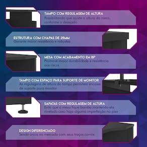 Você curte jogar e quer criar um espaço muito melhor para suas horas de lazer? Para que seus momentos de diversão sejam mais proveitosos e saudáveis, é fundamental ter um espaço pensado especialmente para isso. Além da aparência no estilo gamer, a mesa onde você apoiará seu monitor, teclado e outros equipamentos precisa ser ergonômica e apropriada para este uso. Pensando nisso, a Escrivaninha Gamer 2.0 da Artany tem um formato moderno e que encaixa nas curvaturas do seu corpo. O tampo da mesa tem 6 OPÇÕES DE ALTURA, que se adaptam a cada estilo de corpo dos jogadores. Assim, você evita problemas na coluna e aproveita com muito mais conforto! Com excelentes materiais e superior padrão de acabamento, este produto é um excelente aliado para aprimorar sua performance nos jogos!