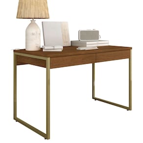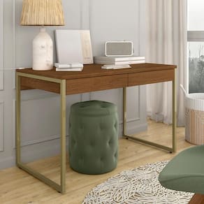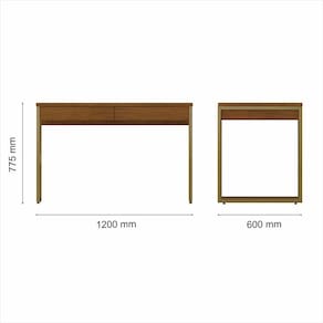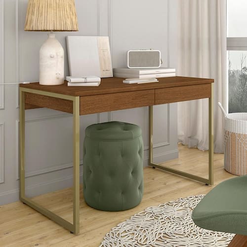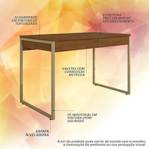 Detalhes Técnicos - Medidas Montadas: A: 77,5cm | C: 120cm | P: 60cm - Material: MDP 15mm/25mm e estrutura em metal - Tampo em MDP de 25mm - Pintura UV - Tonalidade: Dourado/Freijó - 2 Gavetas com Corrediças Metálicas - Cada gaveta suporte até 5kg distribuídos Conteúdo da Embalagem - 01 Escrivaninha - Manual de Montagem - Acessório para Montagem