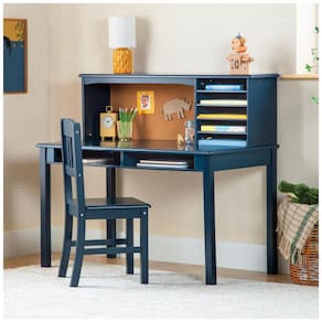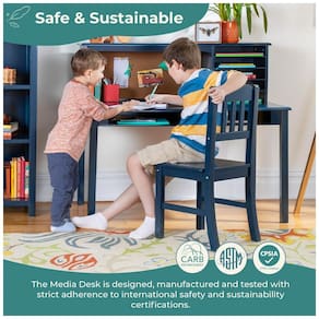 A escrivaninha infantil Guidecraft Kids’ Media Desk and Chair Set em azul marinho foi projetada como estação de estudo para crianças em idade escolar, reunindo mesa ampla, hutch superior com nichos e cadeira coordenada em madeira. A estrutura em madeira maciça de bétula e madeira engenheirada com acabamento laqueado de fácil limpeza oferece superfície estável para escrita, leitura e uso de computador em quartos infantis e áreas de estudo.?