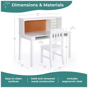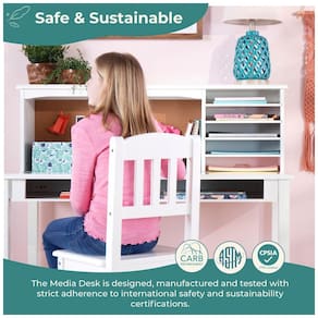 Marca: Guidecraft? Fabricante: Guidecraft? Linha / Estilo: Kids’ Media Desk? Modelo: G27642? Tipo de produto: Escrivaninha infantil com hutch e cadeira? Cor: Branco? Estilo: Moderno? Formato: Retangular? Material da estrutura da mesa: Madeira de bétula e madeira engenheirada com acabamento laqueado? Material da cadeira: Madeira? Componentes principais: Mesa com tampo amplo, hutch superior com nichos, cadeira infantil? Recursos de armazenamento: 5 nichos abertos no hutch e compartimentos frontais no tampo para livros e papéis? Painel de cortiça: Painel de cortiça integrado ao hutch para fixação de lembretes e trabalhos? Passagem para cabos: Recortes para organização e passagem de cabos de equipamentos eletrônicos? Largura da mesa (L): 112 cm? Profundidade da mesa (P): 61 cm? Altura total da mesa com hutch (A): 102 cm? Altura do tampo: 66 cm? Dimensões aproximadas da cadeira (L x P x A): 39 cm x 39 cm x 81 cm? Altura do assento da cadeira: 39 cm? Faixa etária recomendada: Aproximadamente de 5 a 12 anos? Ambiente de uso indicado: Uso interno em quarto infantil, área de estudos, brinquedoteca ou sala de aula? Peso do pacote (produto + embalagem): 34,0kg? Cuidados de limpeza: Limpar superfícies com pano seco ou levemente úmido; evitar produtos abrasivos? Requer montagem: Sim, montagem por adulto? Ferragens e ferramentas: Ferragens e instruções de montagem incluídas? Conteúdo da caixa: 1 escrivaninha infantil Kids’ Media Desk com hutch, 1 cadeira infantil, ferragens e manual de montagem? Manual do usuário: Inglês? Marca: Não Informado