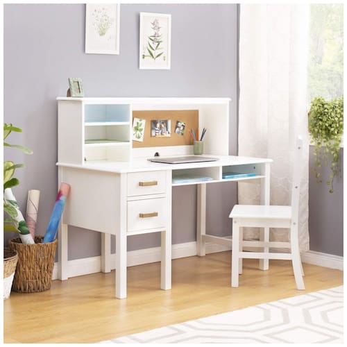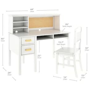 A escrivaninha infantil Guidecraft Taiga Kids Desk and Chair Set with Hutch em branco foi projetada como estação completa de estudo para crianças a partir de 5 anos, combinando tampo amplo, hutch superior com nichos e quadro de cortiça, além de cadeira em madeira coordenada. A mesa oferece dois gavetões com corrediças de madeira e travas de segurança, um nicho aberto sob o tampo para livros ou equipamentos e três nichos no hutch, além de passagem para fiação elétrica na parte traseira para organizar cabos de computador, luminária ou outros dispositivos.?
