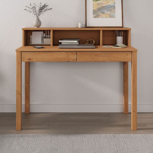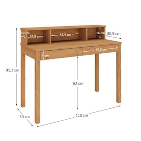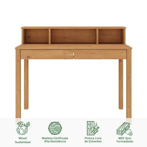 A escrivaninha secretária em madeira maciça Lennox é uma peça elegante e funcional, perfeita para quem busca um ambiente de trabalho ou estudo organizado e sofisticado. Com 2 gavetas espaçosas e 3 nichos na parte superior, ela oferece ampla capacidade de armazenamento para documentos, materiais de escritório e objetos pessoais. Feita com madeira maciça de alta qualidade, essa escrivaninha apresenta um acabamento impecável, destacando a beleza natural, sendo visível os veios da madeira. Seu design moderno combina facilmente com diferentes estilos de decoração, trazendo um toque de elegância para o ambiente. Além disso, a escrivaninha secretária é resistente e durável, suportando o uso diário por muitos anos. utilizando pinturas livre de solventes e sem formaldeído.Confira já!Dimensões do ProdutoLargura: 110 cmAltura: 91 cmProfundidade: 50 cmPeso: 19Materiais e AcabamentoMaterial da Estrutura: Madeira Maciça FingerTinta na cor branca: Branco LavadoTipo da Madeira: PinusFundos das Gavetas: MDF CARBAcabamento: FoscoMaterial dos Pés: Pinus MaciçoTipos de Corrediça: MadeiraRecomendação de Limpeza: Utilize pano levemente úmidoCaracterísticas do ProdutoPossui Prateleiras: SimPossui Rodízio: NãoPossui Gavetas: SimQuantidade de Nichos: 3Quantidade de Portas: 0Quantidade de Gavetas: 2Estilo: Moderno Ambiente Principal: Quarto ou Home OfficePrecisa de Montagem: SimSistema de Montagem: Minifix / Cavilhas / Parafusos.Complexidade da Montagem: FácilVolumes: 01Garantia do Fabricante: 12 mesesMontagem: Recomendamos que seja feita por um profissional.Manual de Montagem: SimDiferenciais:- Produto Versátil- Design Moderno/Rústico- Madeira Maciça- Mais Resistente que MDF- Móvel Sustentável- Madeira Certificada- Pintura Livre de Solventes- MDF Livre de Formaldeído- Produto Qualidade EuropeiaMadeira Maciça:Nossa madeira é proveniente de recursos naturais e é tratada de forma ecologicamente correta para o bem do meio ambiente. Sua resistência e vida útil é superior a móveis de chapa MDF utilizadas pelo mercado. Nossa madeira possui mais resistência ao desgaste natural do tempo, agregando mais durabilidade ao seu produto.Padrão de Cor Branco:O nosso padrão de pintura no branco chama-se branco lavado. Ela é desta forma justamente para aparecer os veios da madeira, indicando um ar rustico e mostrando a robustez do produto. Além que nossas tintas são todas livres de solventes e passam por rigorosos testes de qualidade para serem comercializadas na Europa