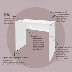 Características: Acabamento em BP Fixação com tambor e parafuso minifix Estrutura Tampo e laterais em MDP 25mm de espessura com fita de borda PVC com 0,45mm de espessura; Travessa em MDP 15mm de espessura com fita de borda PVC com 0,45mm de espessura Sapatas plásticas com regulagem de altura