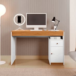 Com um design inteligente, a Mesa de Estudo Madrid 1200 oferece uma gaveta e uma porta para armazenamento eficiente, mantendo seu espaco de trabalho organizado e livre de desordem.