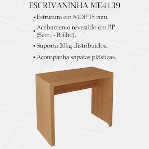 Escrivaninha Mesa Escritorio ME4139, é a opção perfeita para quem busca conforto e funcionalidade em seus momentos de lazer ou home office. Estrutura em MDP de 15mm, proporcionando maior durabilidade e resistência a peça, contando com acabamento revestido em BP (Semi - Brilho). Composta por tampo em MDP, com uma finalização de alto padrão e acompanha sapatas plásticas. Perfeita para deixar seu ambiente produtivo, belo e organizado, ideal para ser utilizada em home office, escritório ou um cantinho de estudos. Este móvel chegará na sua casa separado em 1 volume.