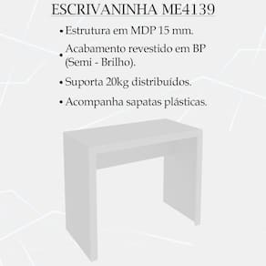 Escrivaninha Mesa Escritorio ME4139, é a opção perfeita para quem busca conforto e funcionalidade em seus momentos de lazer ou home office. Estrutura em MDP de 15mm, proporcionando maior durabilidade e resistência a peça, contando com acabamento revestido em BP (Semi - Brilho). Composta por tampo em MDP, com uma finalização de alto padrão e acompanha sapatas plásticas. Perfeita para deixar seu ambiente produtivo, belo e organizado, ideal para ser utilizada em home office, escritório ou um cantinho de estudos. Este móvel chegará na sua casa separado em 1 volume.