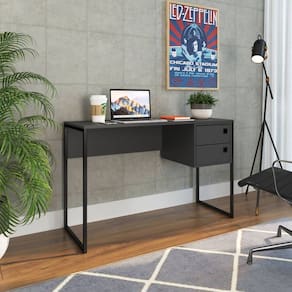 Mesa escrivaninha com design industrial, funcional e elegante, ideal para estudo, trabalho ou uso como mesa de computador. Conta com duas gavetas com puxadores embutidos em forma de furo com acabamento protetor.