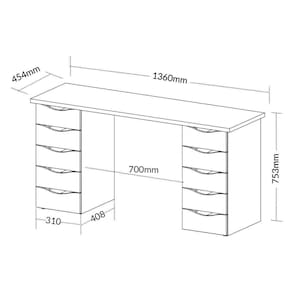Com 10 amplas gavetas, você terá espaço de sobra para manter tudo organizado e ao alcance das mãos, desde documentos importantes até materiais de escritório e objetos pessoais. O tampo espaçoso acomoda seus equipamentos, como computador, notebook e impressora, com conforto, enquanto o revestimento em BP garante durabilidade e resistência a riscos, manchas e umidade.