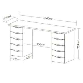 Com 10 amplas gavetas, você terá espaço de sobra para manter tudo organizado e ao alcance das mãos, desde documentos importantes até materiais de escritório e objetos pessoais. O tampo espaçoso acomoda seus equipamentos, como computador, notebook e impressora, com conforto, enquanto o revestimento em BP garante durabilidade e resistência a riscos, manchas e umidade.