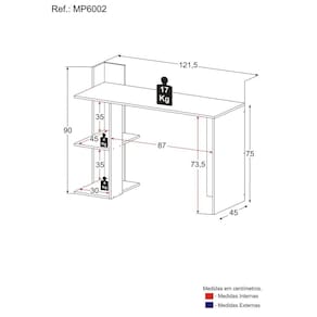 A Escrivaninha Mesa para Computador Dubai Multimóveis é produzida em MDP com acabamento acetinado (cerca de 20% de brilho), que garante maior durabilidade e resistência, além de um acabamento superior. Prática e funcional, possui 2 prateleiras (suportam 4 Kg cada) para manter o seu ambiente organizado e um tampo espaçoso para equipamentos e materiais de trabalho (suporta até 17 Kg). Seu design minimalista, torna o móvel muito versátil, podendo ser utilizado em qualquer ambiente.