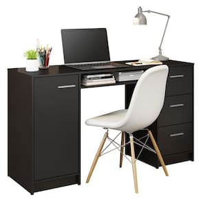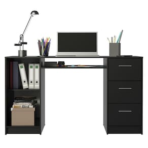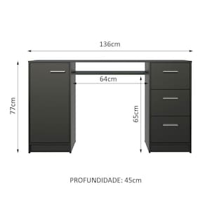 Possui tampo de madeira, três gavetas espaçosas com corrediças metálicas e um nicho abaixo do tampo com abertura na parte de trás.