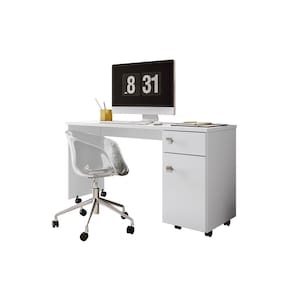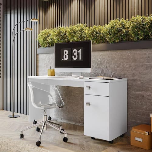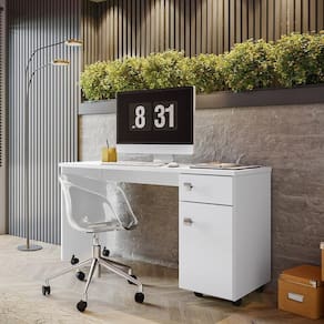 Pintura UV lisa/texturizada, resultando em um acabamento de alta qualidade e fácil manutençãícios e FuncionalidadesOrganização e : A gaveta com chave permite que você armazene documentos e objetos pessoais de forma segura e organizada, mantendo seu espaço de trabalho livre de bagunç Moderno: O acabamento em branco brilhante, combinado com os puxadores cromados, confere um visual contemporâneo e elegante ao seu escritório, ideal para qualquer ambiente.Durabilidade: Produzida com materiais de alta qualidade, a escrivaninha é robusta e resistente, perfeita para o uso diário, garantindo longevidade ao seu investimento.Praticidade: Os rodízios permitem que você mova a escrivaninha com facilidade, adaptando seu espaço conforme a necessidade, sem esforço.Observações ImportantesMontagem: A não oferece de montagem. Todos os móveis vêm com um manual de montagem que contém instruções passo a passo.Cuidados: Para manter a escrivaninha em ótimo estado, utilize um pano seco ou levemente umedecido para limpeza. Evite exposição direta ao sol e umidade excessiva.Imagens: As imagens do produto são meramente ilustrativas. Acessórios de decoração não estão údo da Embalagem1 Escrivaninha Office Malta com 1 Gaveta1 Manual de instruções