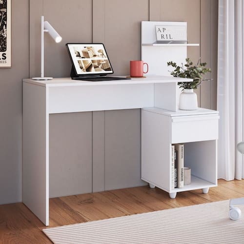 Com design moderno e puxadores em MDF, a Mesa Office Lira alia estilo e funcionalidade. Equipado com corrediças telescópicas de extração total, proporciona acesso completo e fácil às gavetas, garantindo praticidade no uso diário. Produto Montado: Sim Acompanha Manual de Instalação: Sim Ambiente Principal: Escritório codigo_ean: 7900288168443 Complexidade da Montagem: Média: pode ser montado por mais de uma pessoa e/ou necessite de maior conhecimento para montagem Cor: Branco Line Cor do Produto: Branco Line Dobrável: Não Escala de Brilho: Semi-Fosco Espessura do Tampo: 15 mm Gaveta com Chave: Não Itens Inclusos: 1 Escrivaninha, Kit Ferragens e Manual de Montagem. Linha ou Coleção: Complemento Manual de Montagem e Instalação: https://product-hub-prd.madeiramadeira.com.br/951455077/documents/006aa963-b922-4b7a-a25b-88f6d5681eaf2969456531417488861856026.pdf Marca: Móveis Castro Material da Estrutura: MDP Material do Puxador da Gaveta: MDF Material do Tampo: MDP Material dos Pés: Plástico Material Principal: MDP Necessita Montagem: Sim Origem do Produto: Nacional Pés com Regulagem de Altura: Não Pés Reguláveis: Não Peso: 17,55 kg Peso Máximo por Gaveta: 5 kg Peso Máximo por Prateleira: 5 kg Possui Acabamento na Parte de Trás: Não Possui Borda Arredondada: Não Possui Caixa de Tomada: Não Possui Espelhos: Não Possui Estante: Não Possui Gaveta para Pasta Suspensa: Não Possui Gaveteiro: Sim Possui Passa Cabos: Não Possui Porta Objetos: Não Possui Portas: Não Possui Prateleiras: Sim Possui suporte para CPU: Não Possui Suporte para Teclado: Não Possui Vidro: Não Quantidade de Gavetas: 01 Gaveta Quantidade de Prateleiras: 01 Prateleira Recomendações de Uso, Manutenção e Limpeza: Limpar com pano levemente umedecido Sapatas Niveladoras: Não Sistema de Montagem: Parafuso e minifix. Suporta Até (kg): 15 kg Suporta Braço Articulado: Não Tipo de Corrediça da Gaveta: Metálica Telescópica