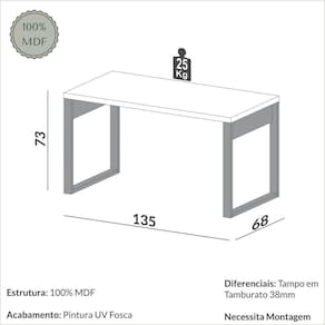 A Mesa estilo da Pradel é perfeita para você que quer deixar seu ambiente de trabalho ou estudos mais estiloso e moderno. Feita em material 100% MDF, é resistente e atende perfeitamente às necessidades do dia a dia. O estilo decorativo é versátil e combina com tudo. Produto Montado: Sim Acabamento do Tampo: MDF Acabamento dos Pés: Pintura Acompanha Manual de Instalação: Sim Ambiente Principal: Escritório codigo_ean: 7900288152817 Complexidade da Montagem: Média: pode ser montado por mais de uma pessoa e/ou necessite de maior conhecimento para montagem Cor: Freijó / Off White Cor da Base: Marrom Cor do Produto: Freijó / Off White Cor do Tampo: Branco Cor Interna: Off White Dobrável: Não Escala de Brilho: Brilhante Espessura do Tampo: 38 mm Formato: Retangular Itens Inclusos: 1 Escrvaninha, Kit Ferragens e Manual de Montagem Linha ou Coleção: Industrial Manual de Montagem e Instalação: https://product-hub-prd.madeiramadeira.com.br/901354628/documents/d02ff740-533a-4ebe-88d4-5584338a93e72934120378117474002922346.pdf Marca: Pradel Móveis Material da Estrutura: MDF Material do Tampo: MDF Material dos Pés: MDF Material Principal: MDF Modelo Infantil: Não Montagem Flex: Sim, mesa simétrica. Necessita Montagem: Sim Origem do Produto: Nacional Pés com Regulagem de Altura: Não Pés Reguláveis: Não Peso: 23 kg Possui Acabamento na Parte de Trás: Sim Possui Borda Arredondada: Não Possui Espelhos: Não Possui Estante: Não Possui Gaveta para Pasta Suspensa: Não Possui Gaveteiro: Não Possui Painel de TV: Não Possui Passa Cabos: Não Possui Porta Objetos: Não Possui Portas: Não Possui Prateleiras: Não Possui suporte para CPU: Não Possui Suporte para Teclado: Não Possui Vidro: Não Recomendações de Uso, Manutenção e Limpeza: Pano levemente umedecido Sapatas Niveladoras: Não Sistema de Montagem: Parafusos, minifix Suporta Até (kg): 25 kg Suporta Braço Articulado: Não