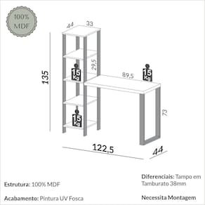A Pradel traz a estação de trabalho industrial F29 WJ na cor off white com Freijó . A estação Industrial possui estrutura 100% MDF e pintura UV, com um excelente acabamento proporcionando uma maior durabilidade ao móvel. Produto Montado: Sim Acabamento do Tampo: MDF Acabamento dos Pés: Pintura Acompanha Manual de Instalação: Sim Ambiente Principal: Escritório codigo_ean: 7900288152954 Complexidade da Montagem: Média: pode ser montado por mais de uma pessoa e/ou necessite de maior conhecimento para montagem Cor: Freijó/Off White Cor da Base: Marrom Cor do Produto: Freijo/Off White Cor do Tampo: Branco Cor Interna: Freijo/Off White Dobrável: Não Escala de Brilho: Brilhante Espessura do Tampo: 38 mm Formato: Retangular Itens Inclusos: 1 Escrvaninha, Kit Ferragens e Manual de Montagem Linha ou Coleção: Industrial Manual de Especificação Técnica: https://product-hub-prd.madeiramadeira.com.br/345526827/documents/ab98dab3-4ab1-4421-ba70-f8a83a2f3c562934724378117474051918754.pdf Manual de Montagem e Instalação: https://product-hub-prd.madeiramadeira.com.br/345526827/documents/e3f6175e-57ec-4d8b-8070-f351c054e483293472337811747405186011.pdf Marca: Pradel Móveis Material da Estrutura: MDF Material do Tampo: MDF Material dos Pés: MDF Material Principal: MDF Modelo Infantil: Não Montagem Flex: Não, só é possível a montagem do produto conforme imagem do anúncio. Necessita Montagem: Sim Origem do Produto: Nacional Pés com Regulagem de Altura: Não Pés Reguláveis: Não Peso: 20,7 kg Peso Máximo por Prateleira: 15 kg Posição da Gaveta: Sem Gaveta Possui Acabamento na Parte de Trás: Sim Possui Borda Arredondada: Não Possui Caixa de Tomada: Não Possui Espelhos: Não Possui Estante: Sim Possui Gaveta para Pasta Suspensa: Não Possui Gaveteiro: Não Possui Painel de TV: Não Possui Passa Cabos: Não Possui Porta Objetos: Não Possui Portas: Não Possui Prateleiras: Sim Possui suporte para CPU: Não Possui Suporte para Teclado: Não Possui Vidro: Não Quantidade de Nichos: 01 Quantidade de Prateleiras: 05 Prateleiras Recomendações de Uso, Manutenção e Limpeza: Utilizar somente um pano levemente umedecido e em seguida passe um pano seco. Produtos químicos ou abrasivos podem acabar danificando o acabamento do móvel. Sapatas Niveladoras: Não Sistema de Montagem: Parafusos, Cavilhas e Minifix Suporta Até (kg): 15 kg Suporta Braço Articulado: Não