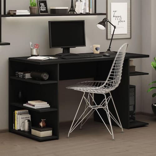 O tampo é super amplo, reforçado e . Além disso, na parte lateral, a mesa conta com várias prateleiras e nichos, assim você pode organizar também aquela decoração que não pode faltar.