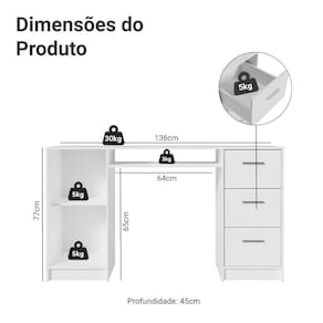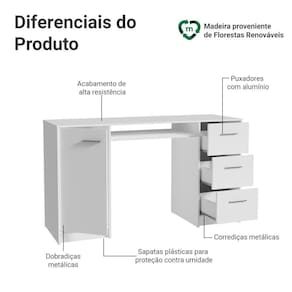 Conta com 3 gavetas, 1 porta e 1 nicho abaixo do tampo, oferecendo espaço ideal para organizar maquiagens, materiais de estudo e o que mais você precisar.