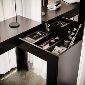 Com 1 porta basculante, 3 nichos organizadores e espaço para eletrônicos e decoração, você terá tudo à mão: maquiagens, acessórios, joias e muito mais!