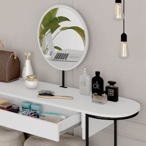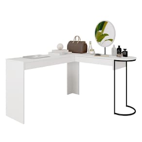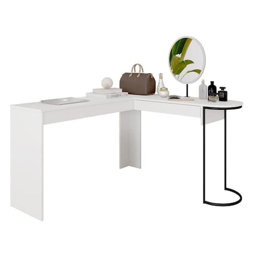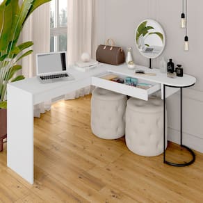 A escrivaninha penteadeira em L com espelho Mavi é uma peça versátil e elegante, ideal para quem busca praticidade. O espelho integrado é um bônus que a torna perfeita para momentos de autocuidado.