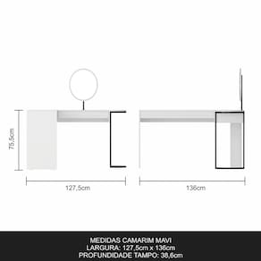 Materiais de Fabricação: - Chapa MDP 15mm / MDF 15 MM - Acabamento: Pintura uv - Estrutura: Metalon - Corrediça Metálica - Possuiu 1 gaveta - A gaveta suporta até 2 kg - Acompanha espelho - Tonalidade escrivaninha: Branco - Tonalidade estrutura: Preto fosco - Estruturado com material de altíssima qualidade, evitando fungos e mofo.