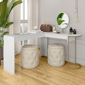 A escrivaninha penteadeira em L com espelho Mavi é uma peça versátil e elegante, ideal para quem busca praticidade. O espelho integrado é um bônus que a torna perfeita para momentos de autocuidado.