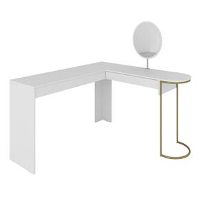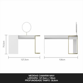 Materiais de Fabricação: - Chapa MDP 15mm / MDF 15 MM - Acabamento: Pintura UV e Pintura PU - Estrutura: Metalon - Corrediças Metálica - Possuiu 1 gaveta - A gaveta suporta até 2 kg - Acompanha espelho - Tonalidade escrivaninha: Branco - Tonalidade estrutura: Dourado - Estruturado com material de altíssima qualidade, evitando fungos e mofo.